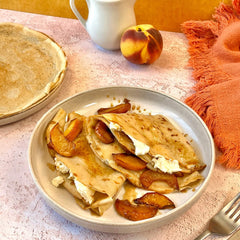 Para armar, esparcir queso mascarpone al gusto en cada crepa, agregar el durazno caramelizado y doblar o enrollar. Servir caliente.