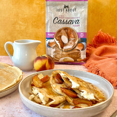En un tazón, mezclar el harina de cassava, leche, huevos, mantequilla derretida, azúcar y pizca de sal hasta que quede incorporado y sin grumos. Dejar reposar la mezcla por 15 minutos.