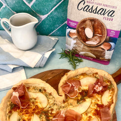 Activa la levadura mezclando con el agua tibia y azúcar. Mezcla bien y deja reposar por 10 minutos mientras fermenta. En un tazón profundo, mezcla el harina de cassava, sal, y aceite de oliva. Agrega la levadura activada y mezcla hasta formar una masa. Amasa ligeramente y cubre con plástico adherente. Deja reposar por 20 minutos