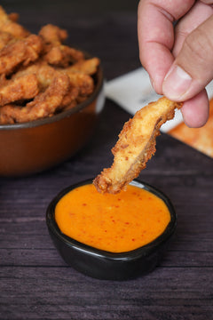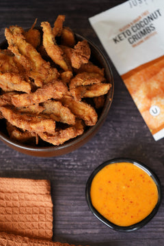 Empaniza las tiras de shiitake: pásalas primero por la fécula, luego por el huevo batido y finalmente cúbrelas con los Coconut Crumbs, presionando ligeramente para que se adhieran.