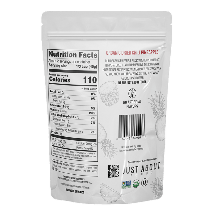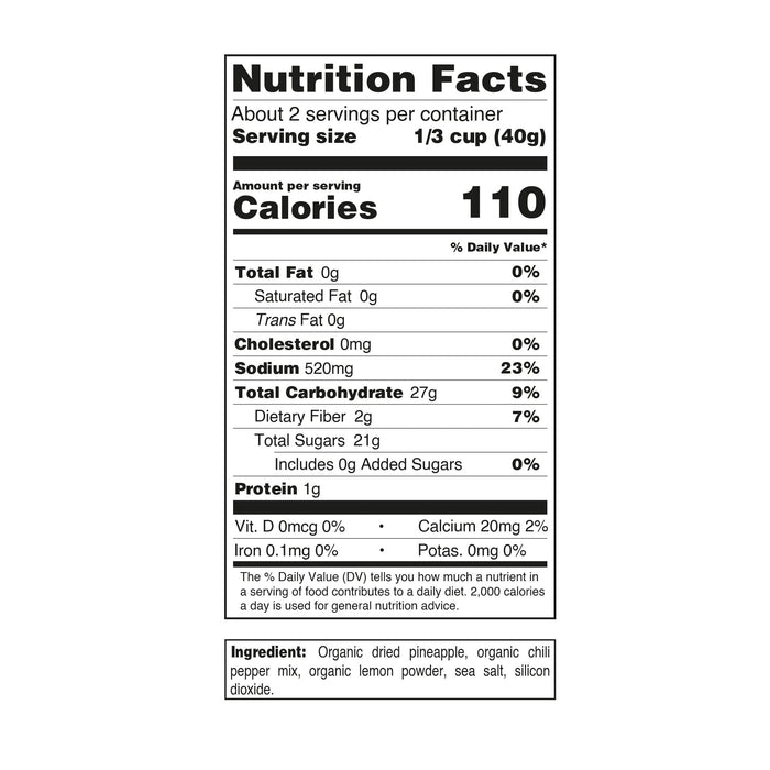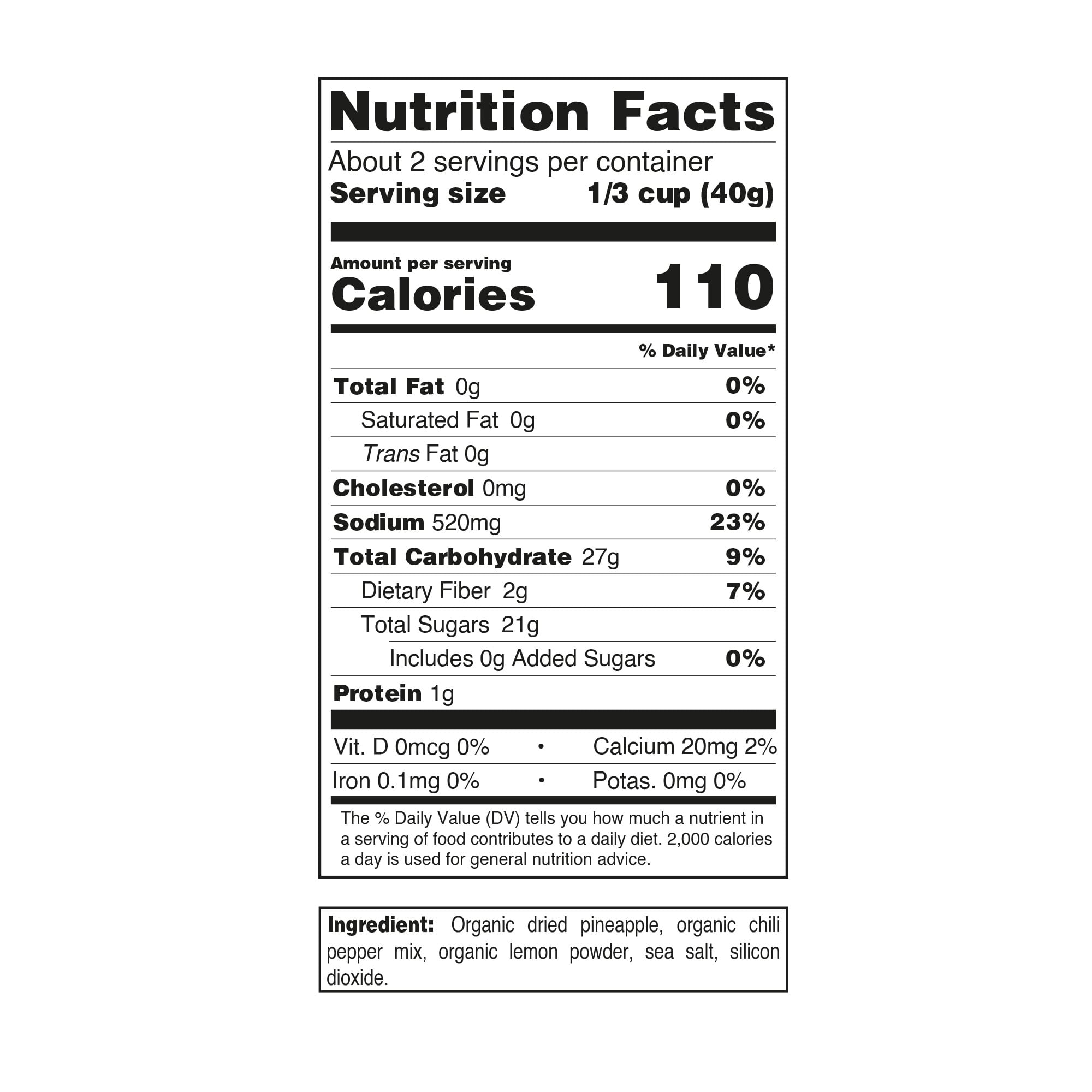 Un toque tropical picante a un snack clásico. Esta mezcla de piña enchilada combina piña deshidratada con una mezcla picante de chiles orgánicos y limón en polvo para brindarte un sabor jugoso y picante en cada mordida.