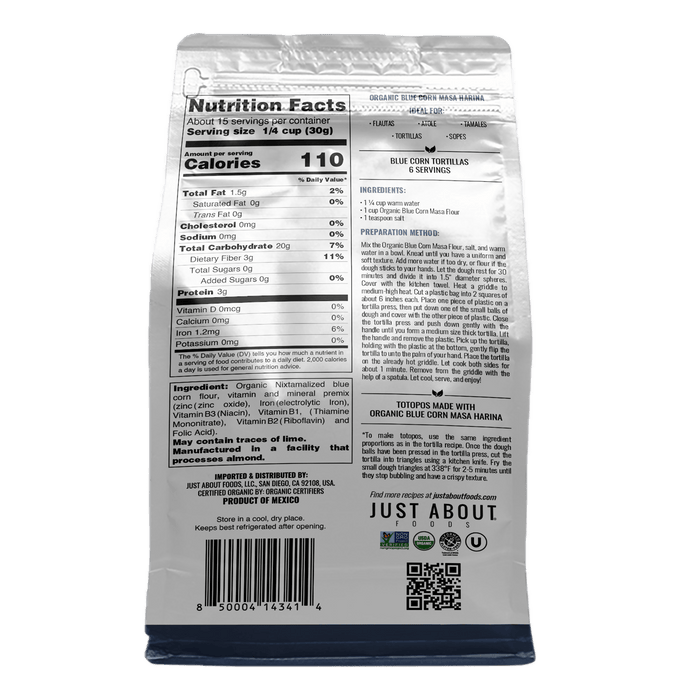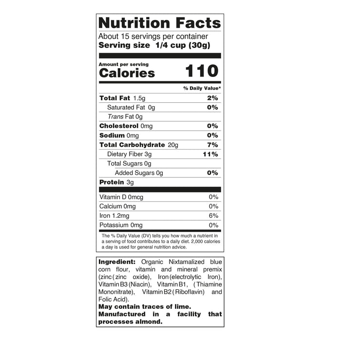 Hecha de maíz azul nixtamalizado, esta harina ofrece un sabor rico y tradicional hecha de ingredientes naturales. Fortificada con vitaminas y minerales esenciales, es una gran opción para cocinar y hornear.