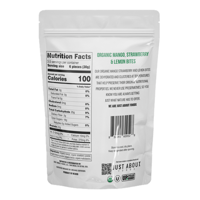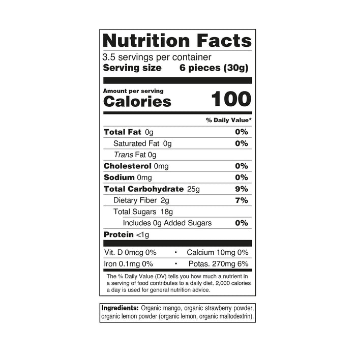 Una mezcla naturalmente dulce y ácida de mango deshidratado, fresa y limón. Estos bites orgánicos están llenos de sabor frutal en cada pieza, sin azúcares añadidos y con todo el sabor de la fruta real.